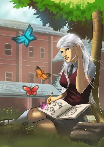 The first thing most people notice about Mia is her hair. It's shiny silver and reaches past her waist. As she tells it, her hair was once fiery red, but the color faded and then altogether disappeared around the same time her paintings began moving. Her hair coupled with her pale skin make her bright blue eyes stand out. Her style is a combination of vintage clothes from the 50's and 60's and modern and she likes to hit flea markets and resale shops to find the next jewel for her closet. Mia is generally a nice person and will go out of her way to put a person at ease around her. She gets a little uncomfortable if attention gets too focused on her though and can come across as shy in the wrong situation. She almost goes nowhere without her sketchpad.